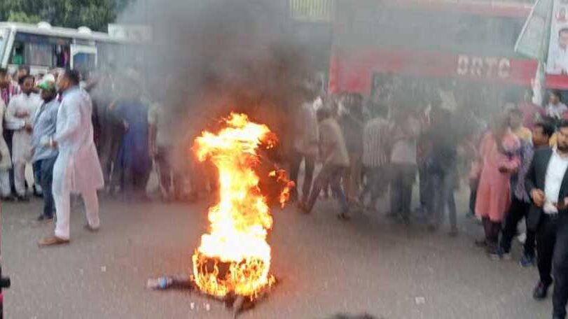 আগুন জালিয়ে সড়ক অবরোধ করছে, গণধিকার পরিষদের কর্মীরা
